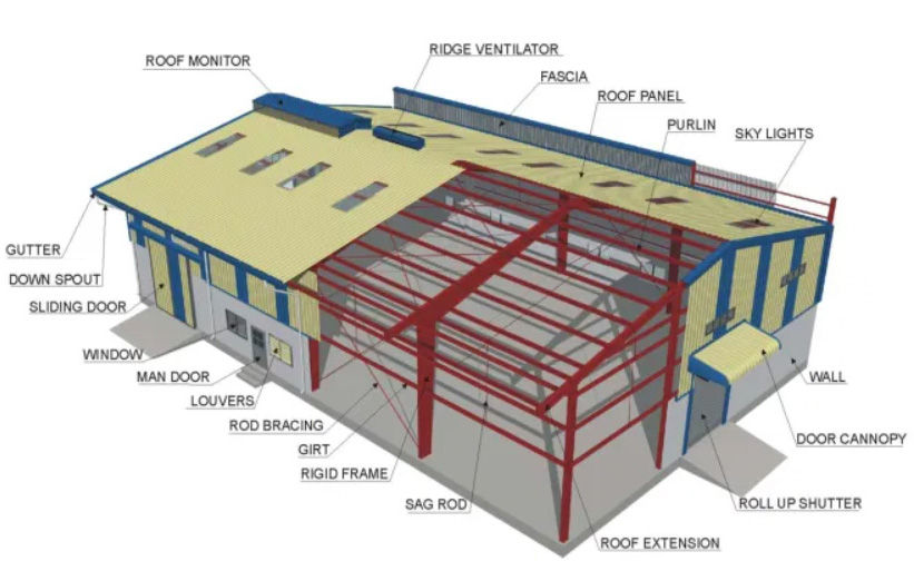 Les bâtiments préfabriqués sont constitués de différents éléments de structure en acier qui sont les suivants